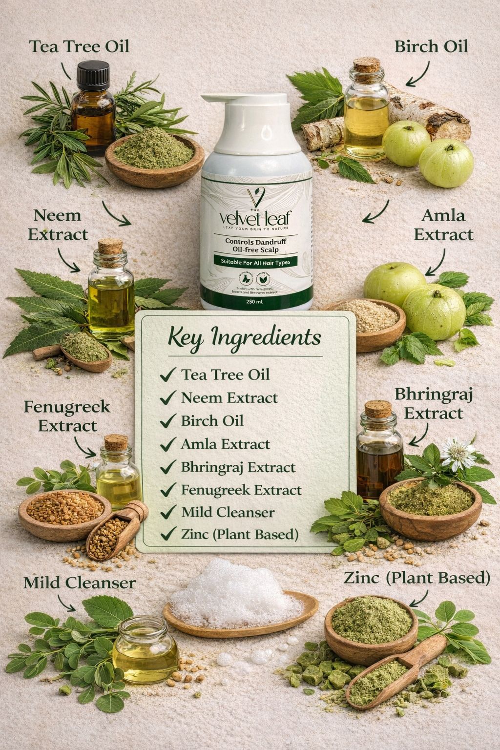 Ingredients list Tea tree oil Neem extract Birch oil Amla extract Bhringraj extract Fenugreek extract Mild cleanser Zinc(plant based) How to use Mix shampoo with a little water, apply on scalp, leave for 5–10 minutes, then rinse thoroughly