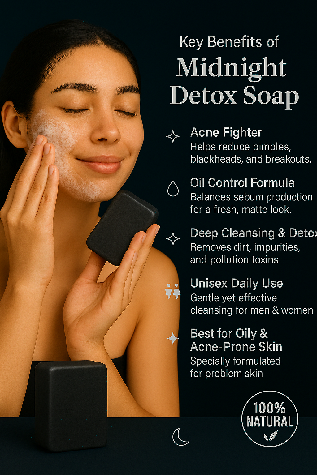 Perfect for urban lifestyles and daily use, the Midnight Detox Soap blends Ayurvedic wisdom with modern skincare needs to give you the ultimate detox experience.